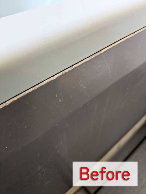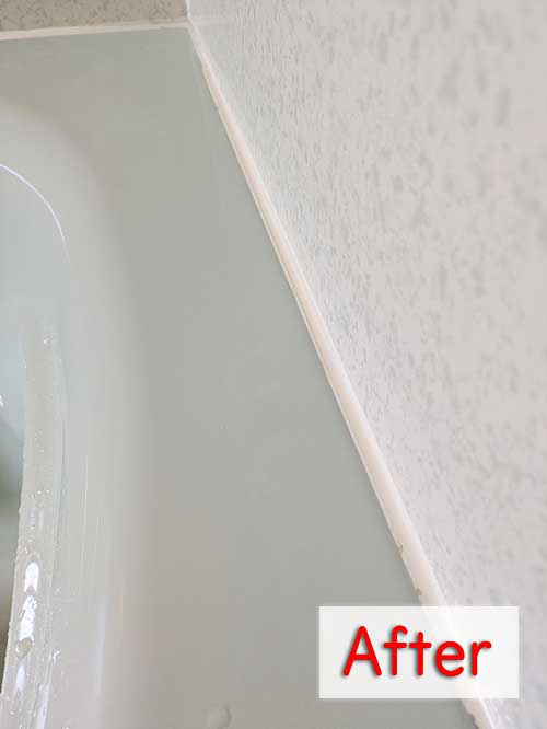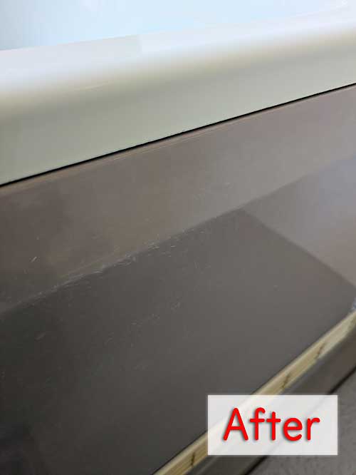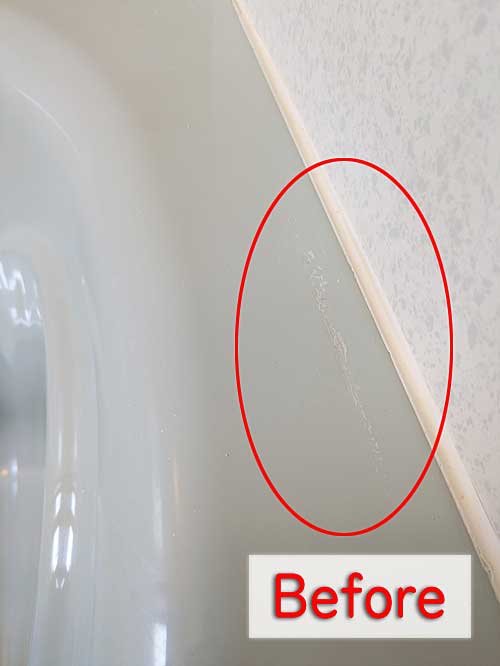 浴槽の側面には石鹸カス汚れが幾重にも重なり、表面の艶を損なってしまっていました。そして、浴槽の縁や水が当たりやすい部分には白く固まったカルシウム汚れ(水垢)がしっかり付着しています。