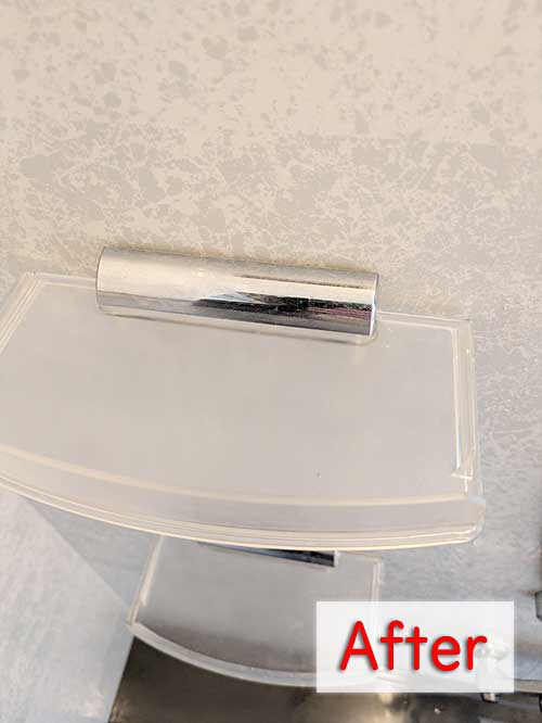 今回の作業では、まず物理的に汚れを丁寧に削り落とし、その後カルシウムを溶解する酸性洗剤で処理を行いました。汚れの性質に合わせて工程を分けることで、素材を傷めずに本来のツヤを引き出していきます。